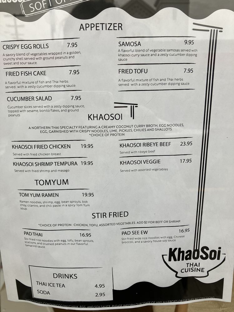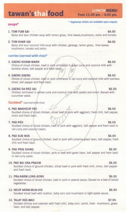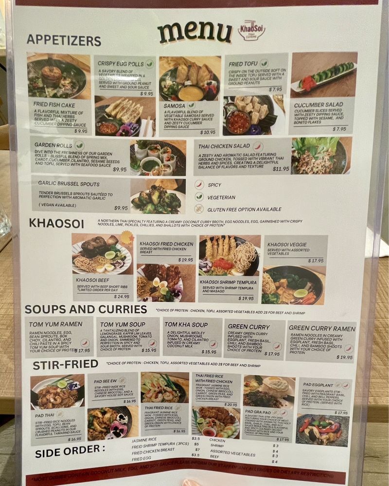 Introducing the menu at Tawan’s Thai Food, located in San Francisco, you can expect a range of options catering to various preferences. From offering vegan and vegetarian options to providing wheelchair accessibility and outdoor seating, this restaurant aims to accommodate a diverse range of diners. Customers rave about their specialty dish, Khaosoi, a mouthwatering coconut milk-based noodle soup available with beef, fried chicken, shrimp tempura, or a veggie version. Reviews highlight the exquisite presentation and delectable flavors of the dishes. Additionally, patrons appreciate the attentive service and cozy ambiance of the restaurant. Overall, Tawan’s Thai Food promises a memorable dining experience with flavorful Thai fusion dishes that exceed expectations.